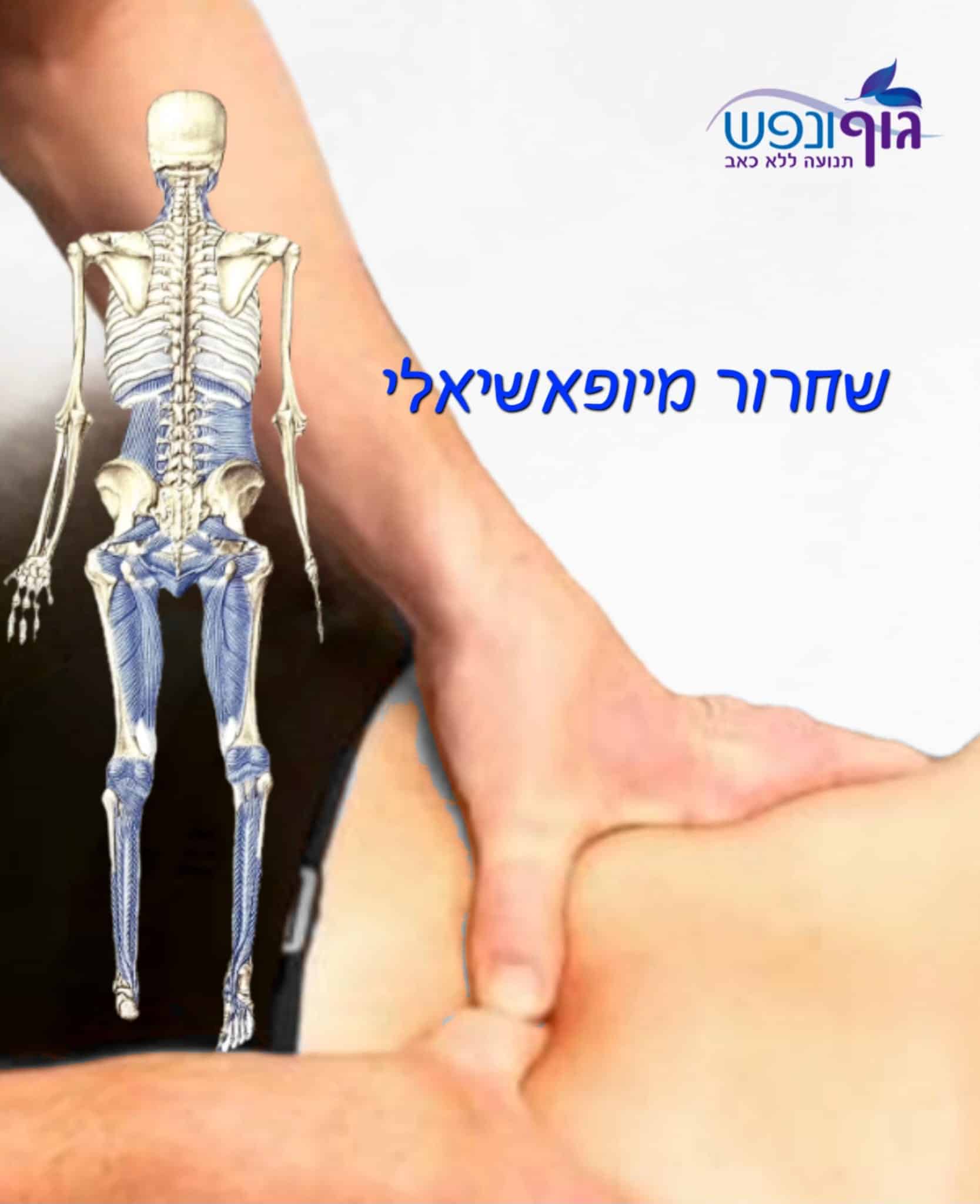 התמונה מציגה מטפל המבצע טכניקת לחיצה ידנית עמוקה על מטופל כחלק מטיפול בשחרור מיופאשיאלי. בצד שמאל מופיע איור אנטומי מפורט של השלד והשרירים האחוריים. במרכז מופיע הכיתוב "שחרור מיופאשיאלי" בעברית, ובצד ימין למעלה לוגו "גוף ונפש – תנועה ללא כאב".